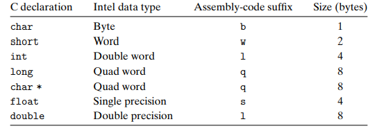 汇编代码用后缀l来表示 4 字节整数和 8 字节双精度浮点数。由于浮点数使用的是一组完全不同的指令和寄存器,所以这不会产生歧义。