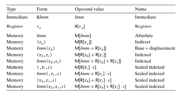 3. 内存引用,根据计算出来的有效地址访问某个内存位置,用符号 表示对存储在内存中 Addr 开始的 b 个字节值的引用,可省去下标 b。