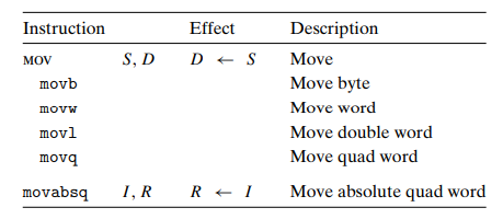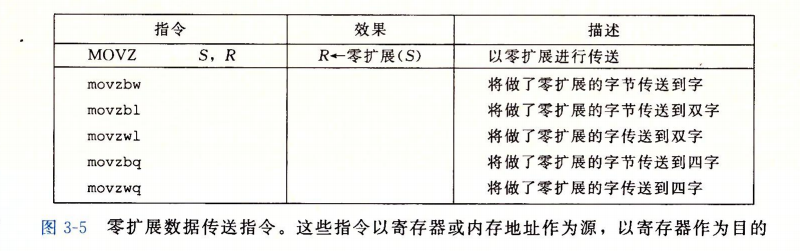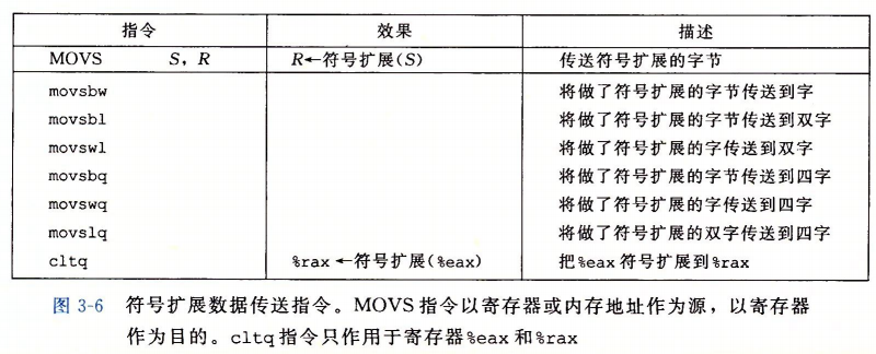 • 注意并没有一条明确的指令把 4 字节的源值零扩展至 8 字节目的,不过可以用以寄存器为目的的 movl 实现(因为他会把高位清零)。