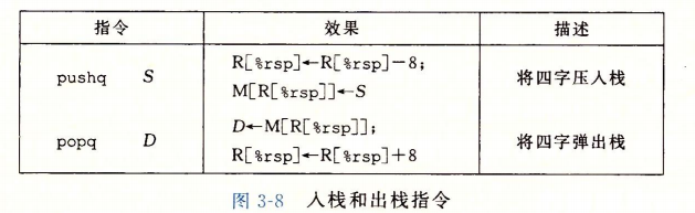 • 将一个四字值压入栈中,首先要将栈指针减 8,然后将值写到新的栈顶地址,因此pushq %rbp等价于subq $8, %rsp; movq %rbp, (%rsp)
