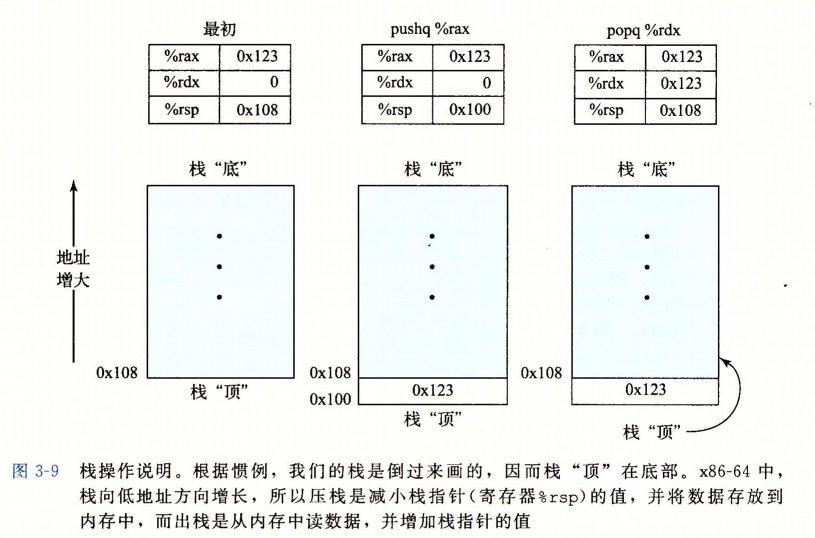 这两个数据传送操作可以将数据压入程序栈中,以及从程序栈中弹出数据。栈总是从一端插入或删除数据,这一端被称为“栈顶”。