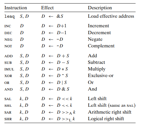 事实上,给出的每个指令类都有对这四种不同大小数据的指令。这些操作被分为四组:加载有效地址、一元操作、二元操作和移位:
