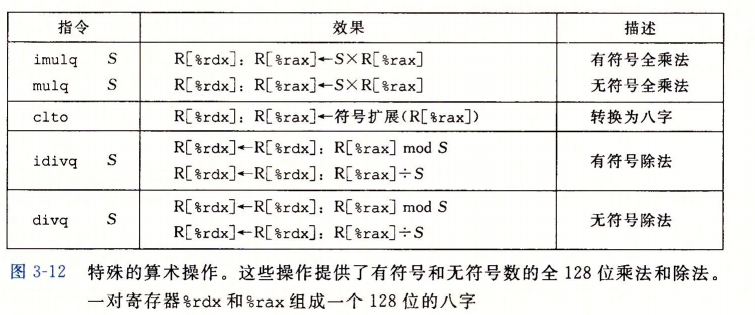 Intel 将 16 字节的数成为八字(oct word),如下是支持产生两个 64 为数字的全 128 位乘积以及整数除法指令: