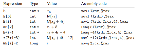 假设整型数组 E 的起始地址和整数索引分别放在寄存器 %rdx 和 %rcx 中,下面是一些与 E 有关的表达式,结果存放在 %eax(如果是数据)或 %rax(如果是指针)中: