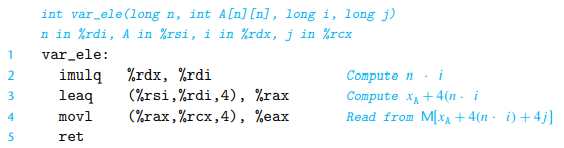 - 注意汇编第一行,由于每一列元素个数无法预知,所以在定位某行首元素位置时需要做乘法来动态计算,而不能使用 leaq 来实现计算了。
