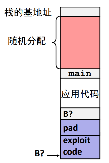 栈随机化的思想是使得栈的位置在程序每次运行时都有变化。实现方式是:程序开始时,在栈上分配一段 0~n 字节之间随机大小的空间,程序不使用这段空间,它会导致程序每次执行时后续的栈位置发生了变化。