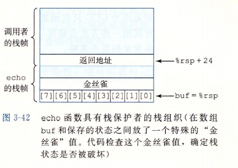 - 在栈帧中任何局部缓冲区与栈状态之间存储一个特殊的金丝雀值(canary)