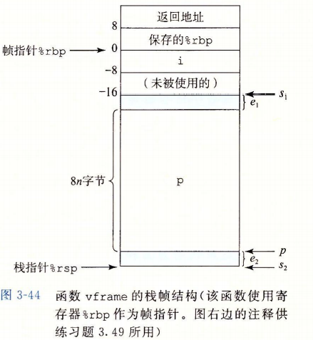可以看到代码必须把 %rbp 之前的值保存到栈中,因为它是一个被调用者保存寄存器,然后在函数的整个执行过程中,都使得 %rbp 指向那个时刻栈的位置,然后用固定长度的局部变量(例如 i)相对于 %rbp 的偏移量来引用他们。