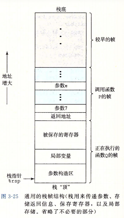 - 当 x86-64 过程所需要的存储空间超过寄存器能够存放的大小时,就会在栈上分配空间。这个部分称为过程的栈帧,即栈中单个过程实例的状态数据。
