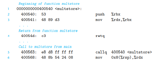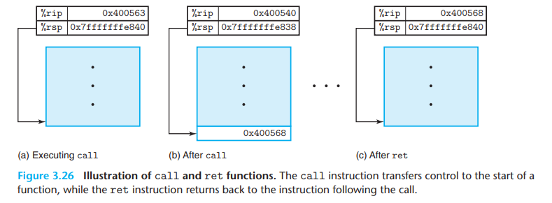 将控制从函数 P 转移到 Q,可以通过 call Q 指令来实现,这个指令会把地址 A 压入栈中,并把 PC 设置为 Q 的起始地址。压入的地址 A 称为返回地址,是紧跟在 call 指令后面的那条指令的地址 易错。