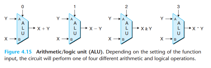 这个电路有三个输入:标号为 A 和 B 的两个数据输入,以及一个控制输入(决定执行何种运算):